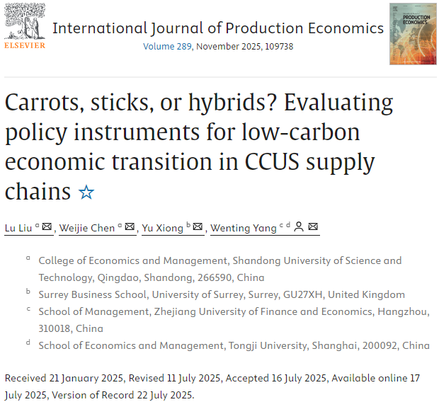 2025年7月,山东科技大学经济管理学院刘露副教授团队在《International Journal of Production Economics》发表题为“Carrots, sticks, or hybrids? Evaluating policy instruments for low-carbon economic transition in CCUS supply chains”的文章。该刊是运营管理领域权威期刊,为中科院一区TOP和ABS 3星期刊,最新影响因子为10.0。