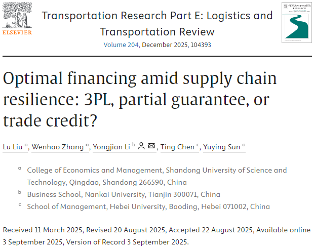 2025年9月,山东科技大学经济管理学院刘露副教授团队在《Transportation Research Part E: Logistics and Transportation Review》发表题为“Optimal financing amid supply chain resilience: 3PL, partial guarantee, or trade credit?”的文章。该刊是运营管理领域权威期刊,为中科院一区TOP和ABS 3星期刊,最新影响因子为8.8。