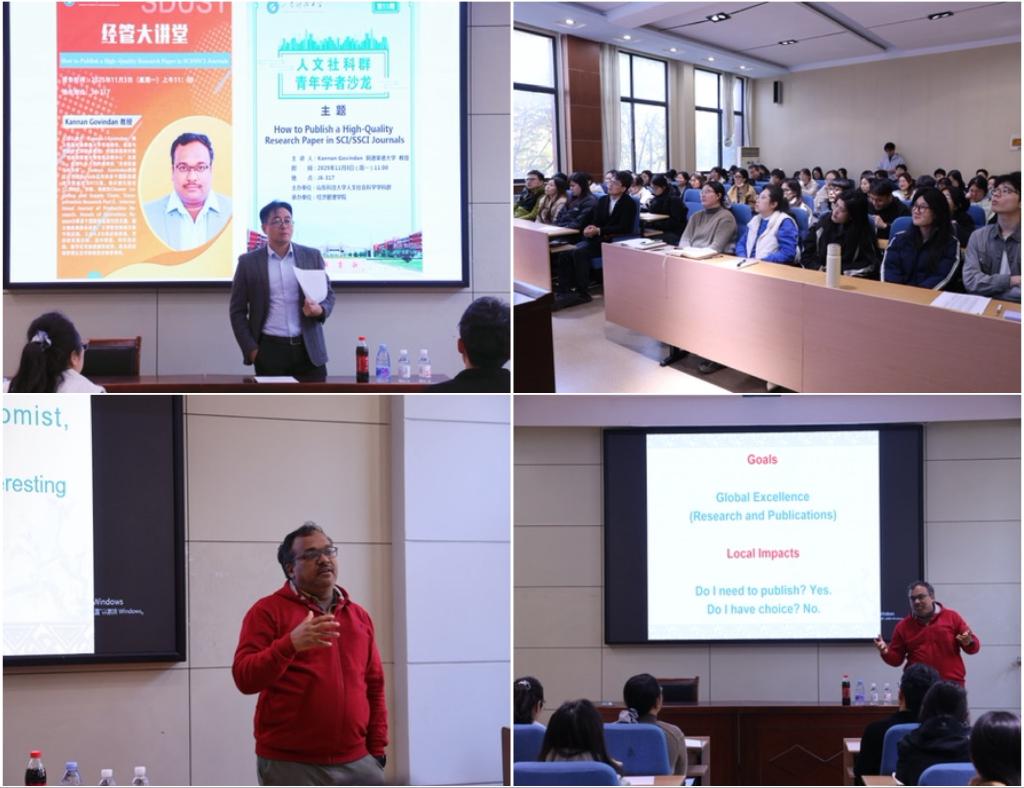 11月3日,经济管理学院在教学楼317会议室成功举办“经管大讲堂”活动。本次活动特邀澳大利亚阿德莱德大学可持续性、能源与资源研究所讲席教授Kannan Govindan担任主讲嘉宾,以“如何在SCI/SSCI期刊上发表高质量研究论文”为题,为学院师生带来一场内容丰富的学术报告。讲座由经济管理学院副院长饶卫振主持。学院党委书记庄兴华、泰山学者青年专家刘露、泰山学者青年专家韩帅以及学院部分教师和研究生共同参加了本次活动。