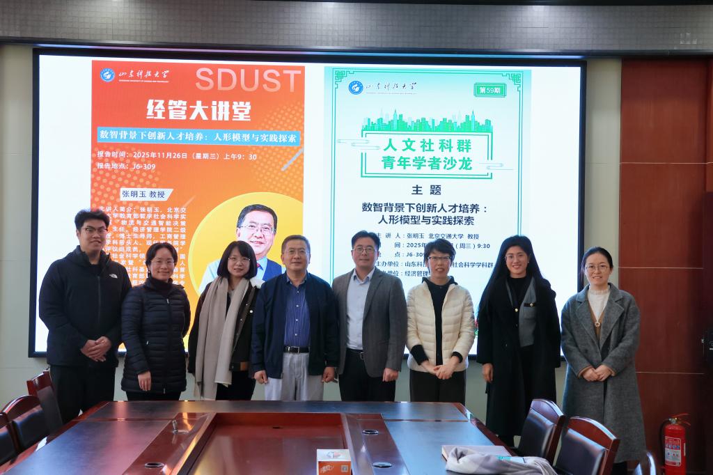 11月26日,经济管理学院于教学楼309会议室举办经管大讲堂活动,特邀北京交通大学经济管理学院教授张明玉担任主讲嘉宾,围绕“数智背景下创新人才培养:人形模型与实践探索”作专题学术报告。讲座由经济管理学院副院长饶卫振主持,山东大学夏宇寰老师、优秀校友路英博士及学院部分教师、研究生参加。