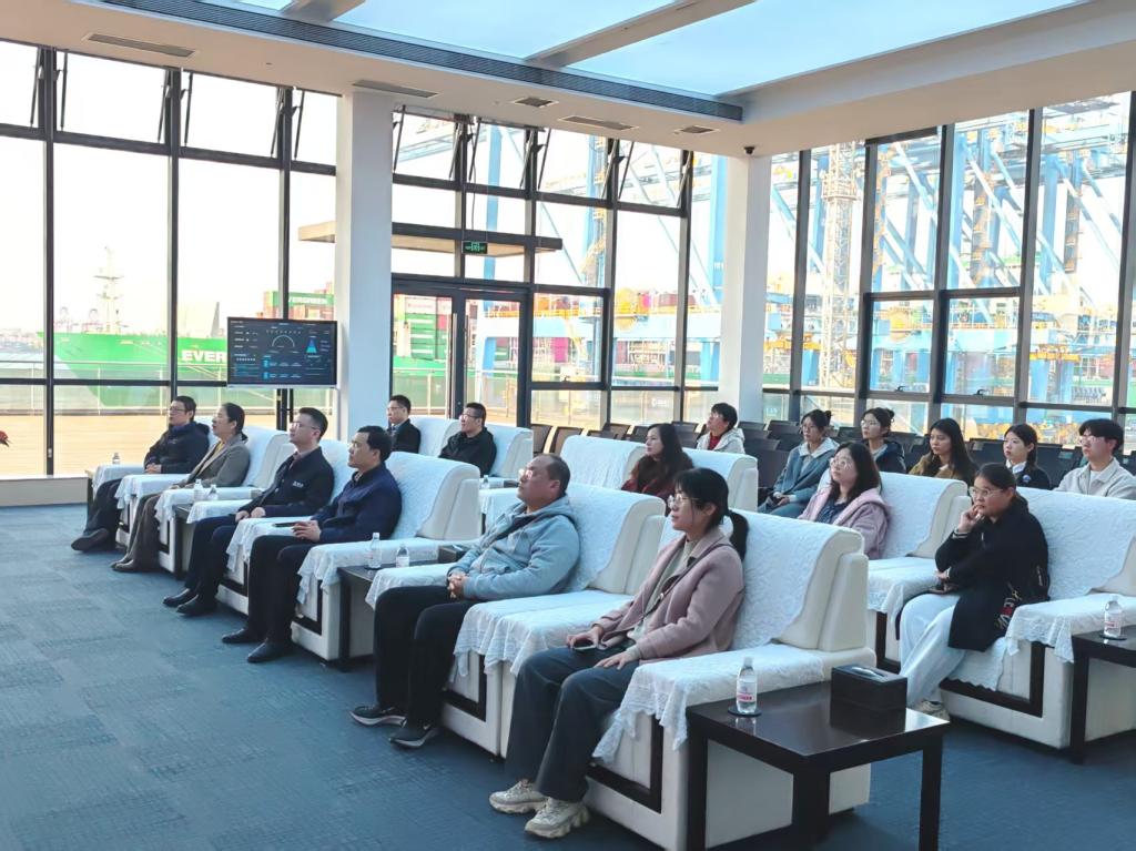 随后,师生代表观看了山东港口宣传片、自动化码头宣传片,了解了自动化码头自主创新、突围破壁的建设历程,凭借“拼命都不一定干得好,不拼命肯定干不好”的创新精神,“连钢创新团队”实现了“五项突破”和十余项全球首创技术,取得了一大批具有自主知识产权的科技成果。大家步入观景平台近距离观摩自动化码头作业现场,全方位感受全球领先、亚洲首个真正意义上的全自动化集装箱码头带来的“中国速度”。期间,学院师生围绕“技术迭代与人才培养适配性”“码头应急保障机制”等问题与码头工作人员展开深入交流。