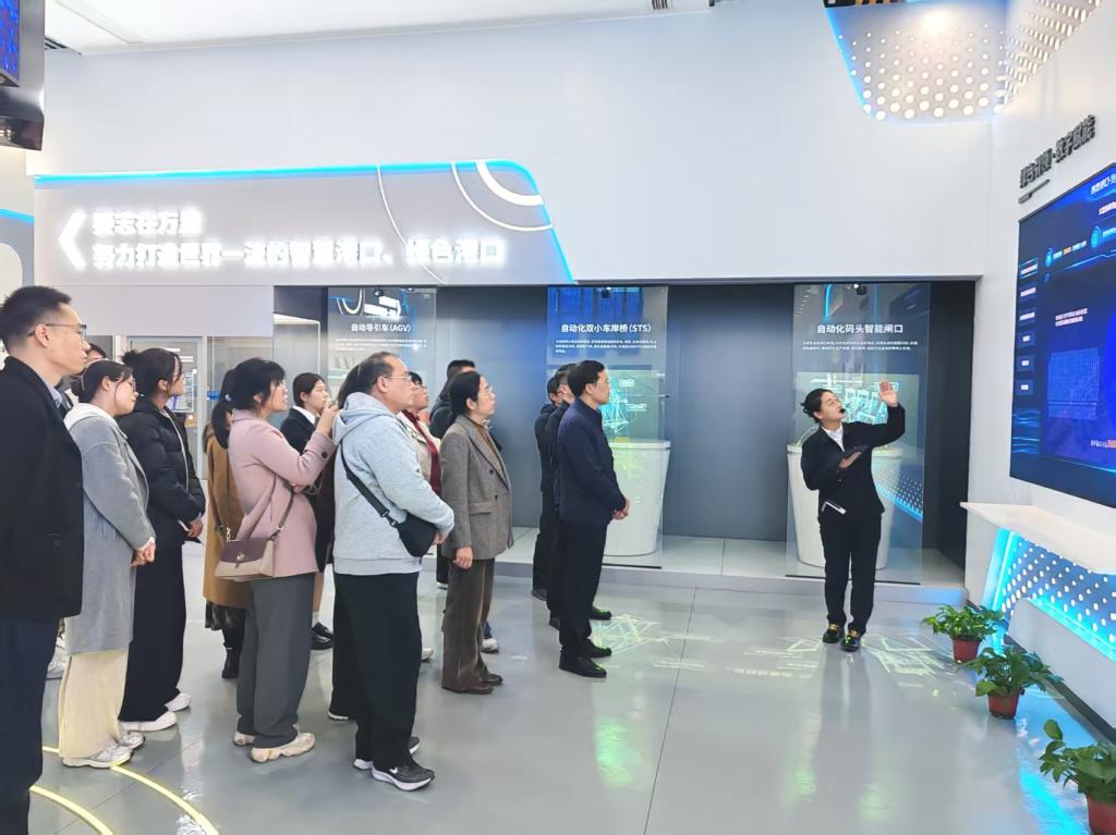 师生代表首先走进全国爱国主义教育基地、时代楷模“连钢创新团队”展馆。展馆内,通过实物陈列、图片展览和视频资料等多种形式,系统呈现了“连钢创新团队”从零起步、攻坚克难,攻克全自动化码头核心技术“卡脖子”难题的奋斗历程。从自主研发自动化控制系统,到打破国外技术垄断、建成全球领先的全自动化集装箱码头,团队“敢为人先、追求卓越”的创新精神与“为国争光、勇担使命”的爱国情怀,让在场师生深刻理解了“时代楷模”精神的内涵和价值。参观过程中,江斌结合码头实际运营案例,深入浅出地讲解了无人控制等新技术如何与港口作业深度融合。从无人集卡的智能调度、自动化桥吊的精准装卸,到一体化物流监控系统,新质生产力不仅推动码头作业效率大幅提升,更实现了能耗降低、碳排放减少的绿色发展目标,打造出全球智慧港口的 “中国标杆”。