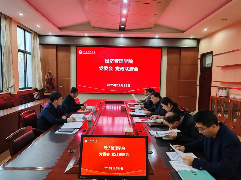 11月25日,经管学院召开党委会、党政联席会,学院领导班子成员参加会议,校党委组织部正处级组织员许志伟、校纪委综合处副处长李磊列席旁听,会议由院党委书记庄兴华主持。