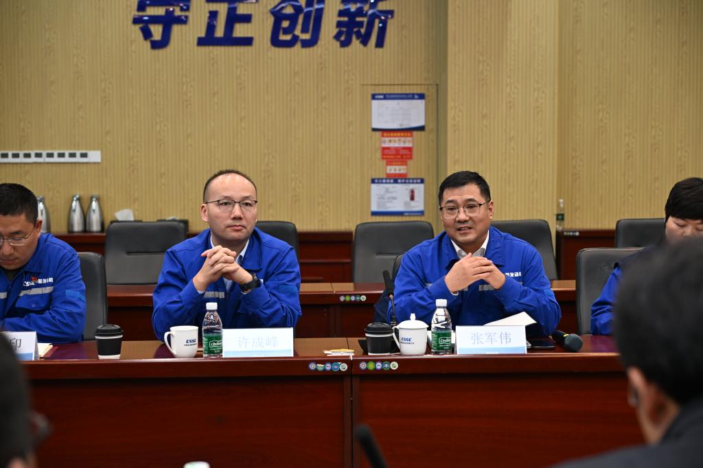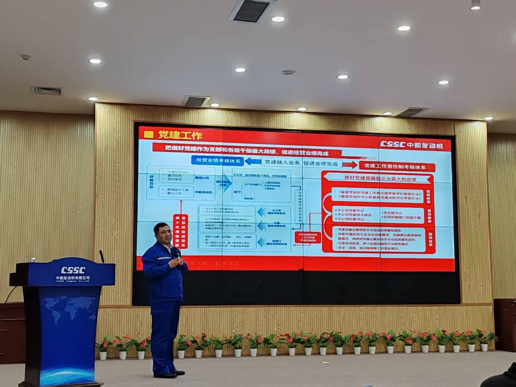 参观结束后,中船发动机有限公司营销质量党支部书记张军伟以“党建引领绿色动力创新,产研协同服务国家战略”为题作专题报告。报告重点解读了公司“五四三一”党建工作体系的核心内涵——即五个融合促发展、四个作用聚合力、三个保障强根基、一个目标领方向,系统介绍了营销质量党支部在强化党建引领、凝聚支部合力、推动党建与业务深度融合等方面的实践经验,分享了企业在绿色动力技术研发、产业链协同创新等领域的丰硕成果,彰显了党建工作对企业高质量发展的引领保障作用。