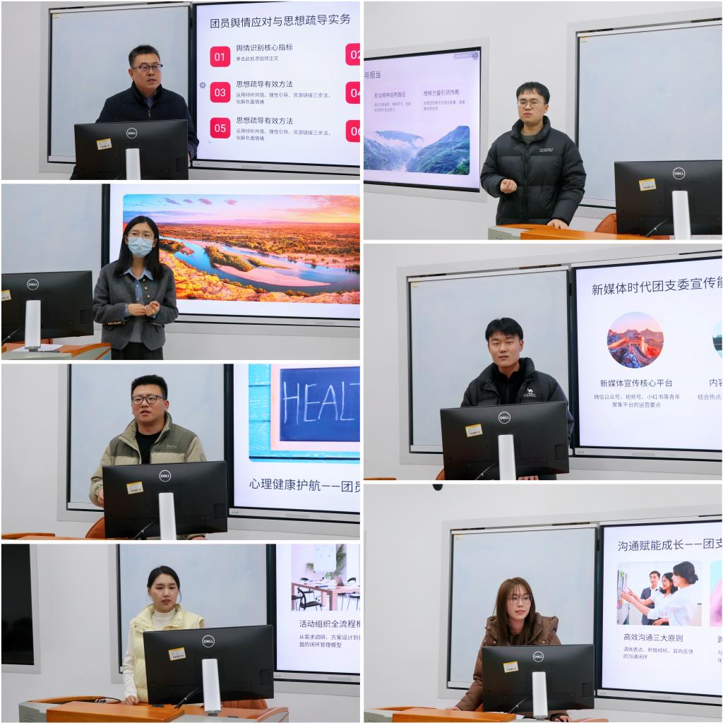 曲长胜、范文洁、王鹏民、李含聪、孙小寒、于鹏伟、樊玮结合自身工作经验和生动案例分析,分别围绕“团员舆情应对与思想疏导实务”“新时代团支委思想引领能力提升”“团员心理疏导基础知识与危机识别”“团支委活动组织与统筹协调能力训练”“团员骨干的责任与担当”“新媒体时代团支委宣传能力提升”“团支委高效沟通技巧”等展开专题讲解,教育引导学生注重增强班级凝聚力,积极投身实践积累经验,自觉规范网络言行,提升网络文明素养,主动突破信息“茧房”,勇于走出舒适区,实现自我成长与全面提升。