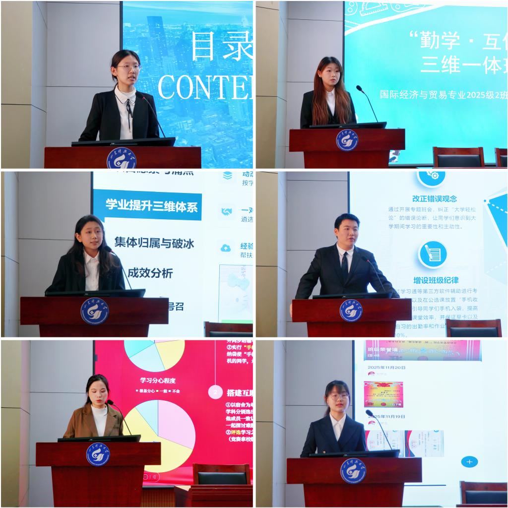 2024级、2025级班级负责人结合班级实际情况,从“学风建设立项背景”“班级学风问题分析”“学风建设重点举措”“预期成效与评估”等方面进行汇报,分享了通过制定班级公约、组建学霸帮帮团、搭建资源共享平台、完善奖励和约束机制等多种形式提升班级同学学业水平、英语四六级通过率、学科竞赛参与率与获奖率等,展现了以制度促学风、以互助强学风、以标杆领学风、以实践验学风的建设思路。