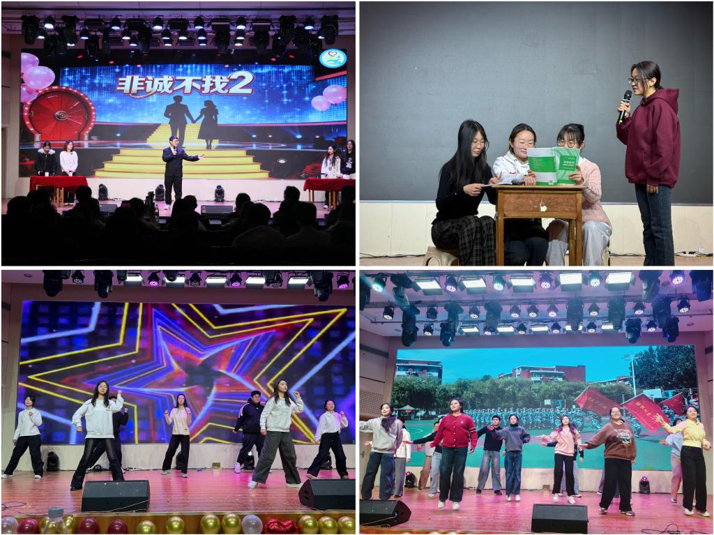 晚会共分为“青春启航”“梦想飞扬”“未来可期”三个篇章。联欢会在开场舞《Zaa》中正式拉开帷幕,舞蹈队以富有感染力的表演点燃全场气氛;声乐队献唱《改变自己》,以轻快旋律传递积极向上的力量;礼仪宣讲团则通过旗袍走秀《一袭旗袍,一梦芳华》,以优雅风姿展现传统服饰之美;体育部创意表演《天竺少女》与《无实物表演》生动有趣,欢笑连连;社团部小品《“钱”途似锦靠“慧”买》倡导理性消费观念;器乐队演奏《出现又离开》旋律悠扬,情感真挚;科创部通过小品《违纪伤我心,安全在我心》强调校园安全与纪律意识;就业服务部、大学生一站式服务中心与学权部联合呈献舞蹈《喜乐年华》,展现昂扬青春风貌;新媒体与易班共同带来光影秀《羽翼丰满》,以独特视觉艺术再现校园生活点滴;朗诵队作品《我与高数的爱恨情仇》以幽默语言道出学子心声;心健联小品《非诚不找2》则以真挚情感引发共鸣;志愿服务部的小品《时间都去哪了》则引发观众对时光珍惜的思考。兼职辅导员们活力演绎《红日》《达芬奇》《像你这样的朋友》,以热情洋溢的表演为晚会画上圆满句号。