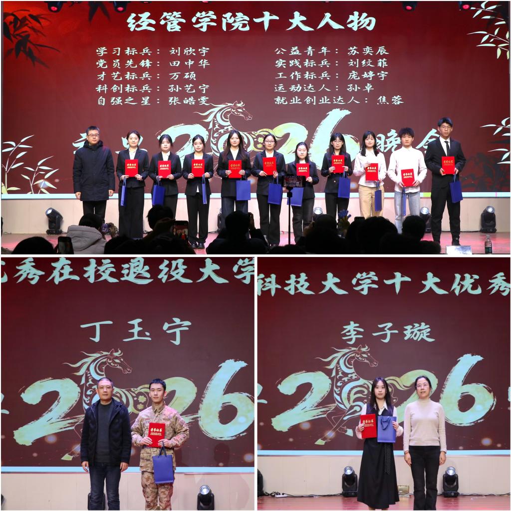活动中场,进行经管学院“年度人物”颁奖典礼,表彰优秀退役在校大学生丁玉宁、2025年度经管学院“十大年度人物”(学习标兵刘欣宇、党员先锋田中华、才艺标兵万硕、科创标兵孙艺宁、自强之星张皓雯、公益青年苏奕辰、实践标兵刘纹菲、工作标兵庞婷宇、运动达人孙卓、就业创业达人焦蓉)、山东科技大学2025年度“十大优秀学生”李子璇,引领全院学子汲取榜样力量,砥砺奋进。