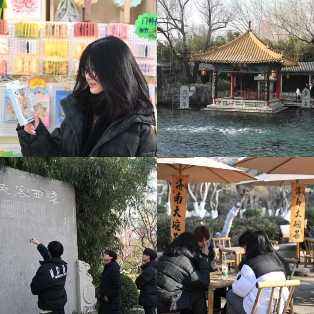 实践队先后探访五龙潭、趵突泉、大明湖、超然楼等标志性景观。在五龙潭,成员观察市民日常取水场景,感受泉水与市井生活的紧密联结;于趵突泉观澜亭前,领略“天下第一泉”的磅礴气势与碑刻文化;漫步大明湖畔,体会免费开放后湖区作为“城市客厅”的公共价值;驻足超然楼下,关注灯光仪式带动消费的现象。通过对比不同景区的功能定位与运营模式,团队深入思考文旅融合中文化本真性与商业开发之间的平衡之道。